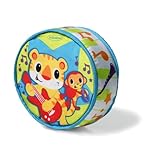This little "drum" was a gift for my 5 month old daughter who was getting into slapping things with her hands. She loves it. I love it. The great thing about it is it has a soft pillow top and sides, but the weird thing is, it doesn't actually play drum noises. It plays two tunes in piano. The cool thing is, it responds to the slightest tap, has a low and high setting and an off switch. Each tap gives you a note and they create a song that way. It's a lot of fun, my husband and I both enjoy it :) I recommend it for a young baby. Even if they chew on it, it's fine because it's soft.