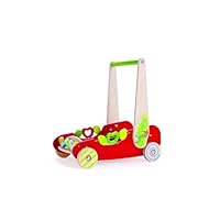I am on a mission to avoid buying any new plastic stuff for our baby. If I have bought any plastic mass manufacture stuff it has been used. Let someone else's kid get those strong fumes and spend big bucks on things that are used for mere months. I purchased this as I thought a push toy would be useful for my daughters development. This is a nice Eco toy. Not a lot of excitement to it but if I am going to buy this kinda of thing new I want wood and quality. I am giving this just 4 stars as it could really use some kind of tension setting for early walkers to keep them from wiping out. We solved this by adding textbooks for weight. If I had known about it I may have skipped on this and bought the Ekorre walker from IKEA instead. Certainly not Eco friendly but it is made of wood also but includes a feature where you can adjust the tension of the casters so that your kid doesn't face plant. The bonus is that Ikea's is half the price of the Hape.