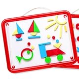Love the magnetic board for traveling. The shapes are fun and include a good variety: arcs, bars, equilateral and scalene triangles, half circles, as well as your usuals. The weird rope idea is poorly done, though. A rope handle mounted at the top would have been much more useful and wouldn't take away board space. The holes in the board aren't terribly annoying if you're using letters or numbers, but it can get in the way when using shapes.
