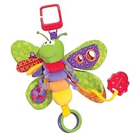 We usually keep this toy reserved for when we go out. It has allowed us to eat peacefully at restaurants several times. Our daughter loves playing with the very colorful, crinkley wings, looking at the little mirror, and chewing on the teether. Freddie jingles when you shake him and there's also a squeeker in one of his wings.