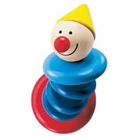 My son is four and a half months old, and while the toy may be a little difficult for him to grab as of yet(good, IMHO because he gets more practice!), he absolutely loves the bright colors and most of all, the face on the clown. The clicking noise the toy makes as it moves back and forth is also very interesting to my baby and sometimes I even find it soothing to click during "quiet time". I am extremely happy with this toy and feel at ease knowing there is NO plastic on it and the paints are all water based and non toxic. Even though the toy is made from hardwood, he really loves to chew on it (Who needs those soft rubbery teethers??!)